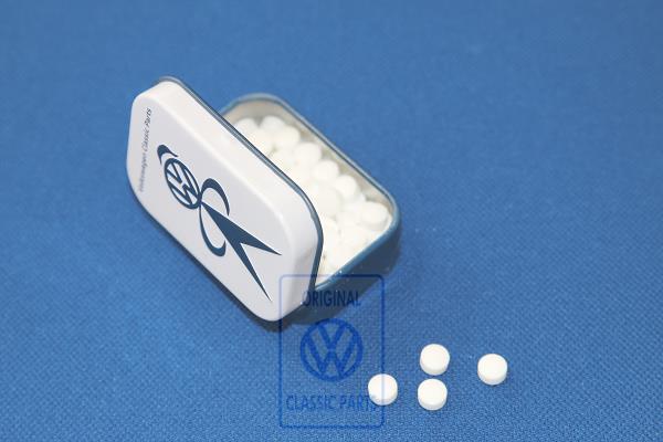 Small pill box in a 50s Volkswagen design. The little metal box is filled with peppermint drops and fits perfect in to your classic car or pocket.